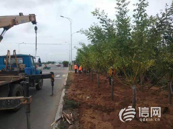 克日,在西海岸新区204国道城区以北段绿化工程现场,挖掘机挥舞长臂精准刨坑,大型吊车将苗木吊运至树坑内,工人们有的挥锹培土,有的牢靠苗木,施工现场一派忙碌情形 。
